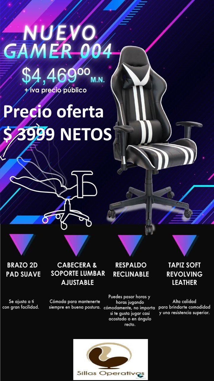 respaldo: alto con cabecera, hule espuma laminado flexible con densidad de 50 kgs/m³ y alta resilencia; mecanismo con palanca para ajustar el ángulo de inclinación del respaldo (sistema de contacto permanente).